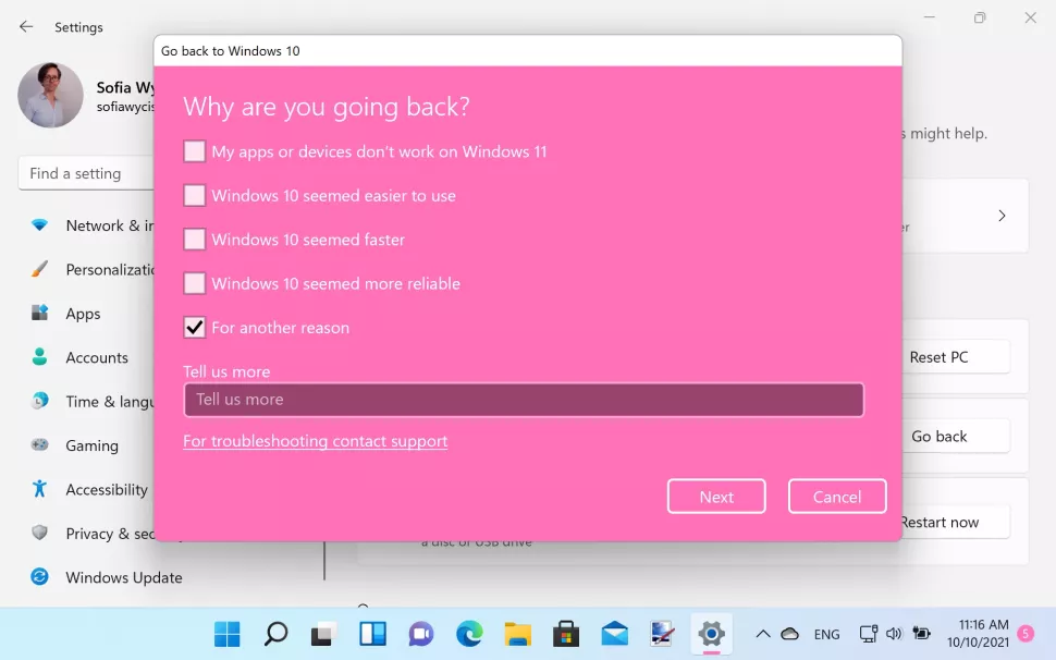 همانطور که گفته شد؛ در این صفحه از شما سوال می شود که چرا می خواهید از ویندوز ۱۱ به ویندوز ۱۰ برگردید. انتخاب گزینه درست اجباری نیست و صرفا برای جمع آوری دلایل کاربران هتگام ریستور برای مایکروسافت مهم است.